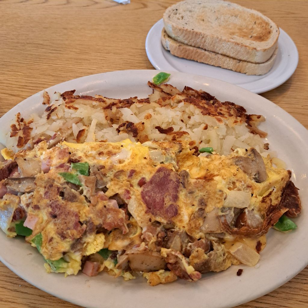 I enjoyed the Everything Omelet with hash browns and rye toast on another visit, because I was in the mood for spinach, mushrooms, and ham. The rye toast was perfect. I added some grape and strawberry jam from the packets on the table and enjoyed it. The Everything Omelet is made with 4 eggs, onions, tomatoes, peppers, mushrooms, ham, bacon, sausage, gyro meat, corned beef, Swiss and American cheese. It was a lot, but it was really tasty. And I just realized there wasn’t any spinach in it. I’ll be sure to order the spinach and feta omelet next time. I took about a quarter of it home for later because I couldn’t finish it.