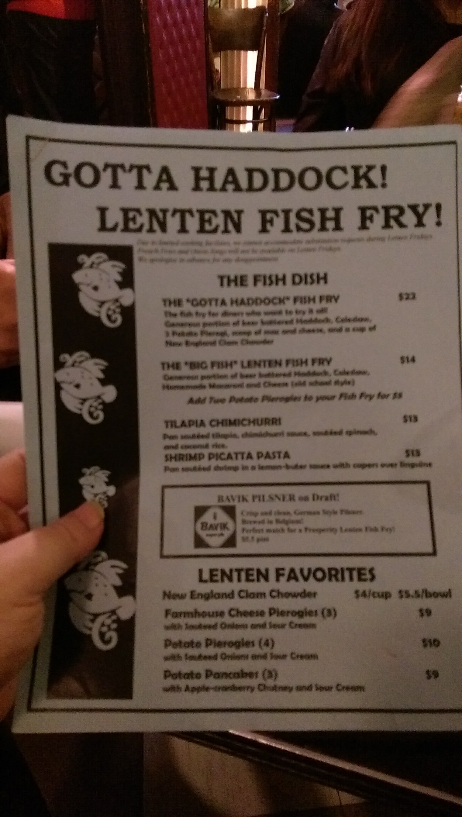 I have been here several times during Lent for the fish fry. The fish and pierogi are top-notch here, so the place is always packed. Reservations are a must. It gets so busy on Fridays during Lent that they have a limited menu, serving nothing but the fish fries and pierogi and a couple other entrees. The kitchen just cranks them out. Apparently they can do the beer battered fish using hearts of palm if you are vegan, but I don’t know if that is possible during Lent. It doesn’t hurt to call to ask. I highly recommend the “Gotta Haddock” Fish Fry, because you get the fried haddock, coleslaw, potato and cheese pierogi, homemade mac n cheese, and a cup of New England clam chowder. The pierogi are pictured above with the brown caramelized onions on top. The “Big Fish” comes with the fish, coleslaw and the mac n cheese. You can always add pierogi for an upcharge. And you’ll want to have the pierogi. They are amazing.