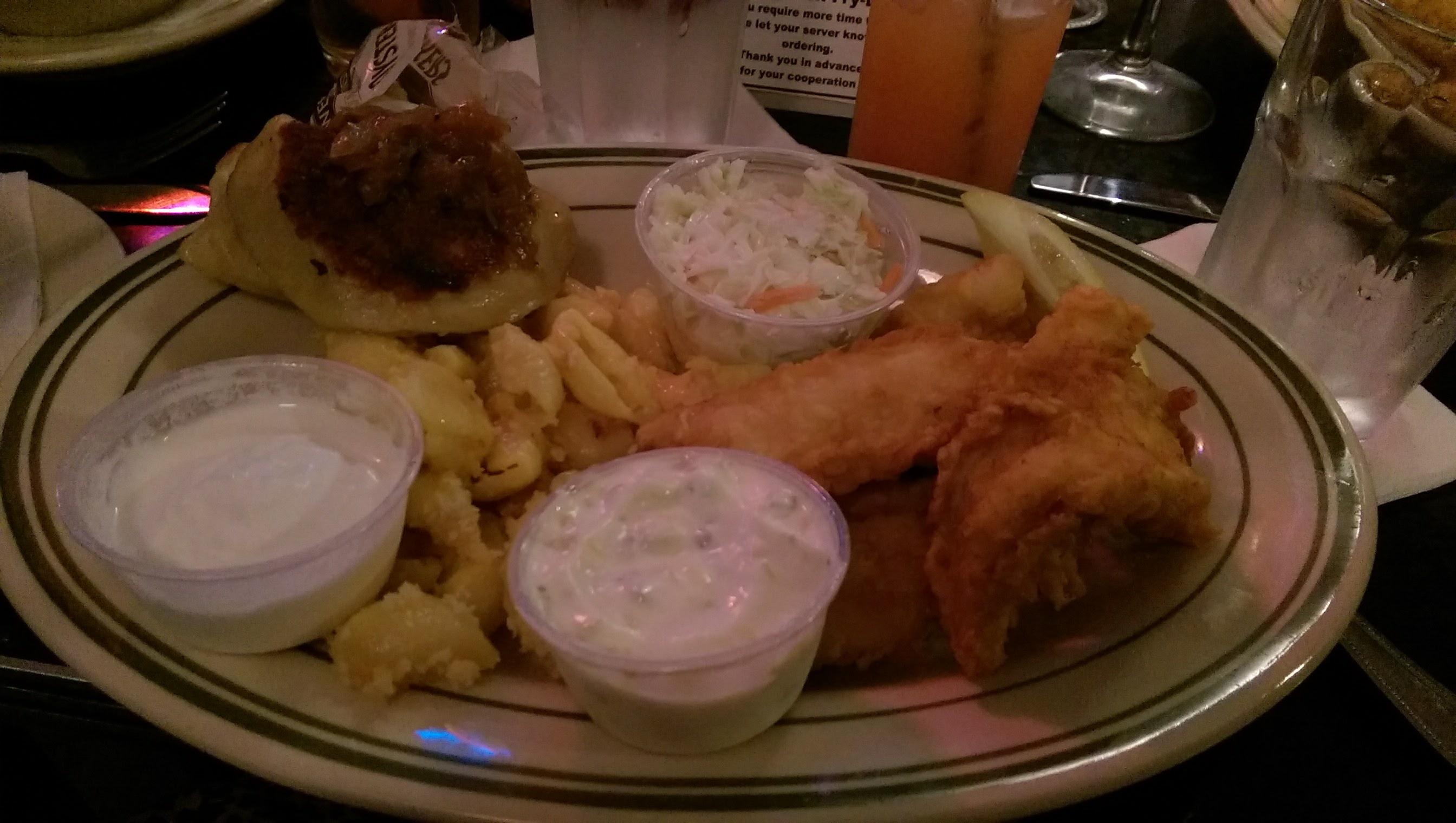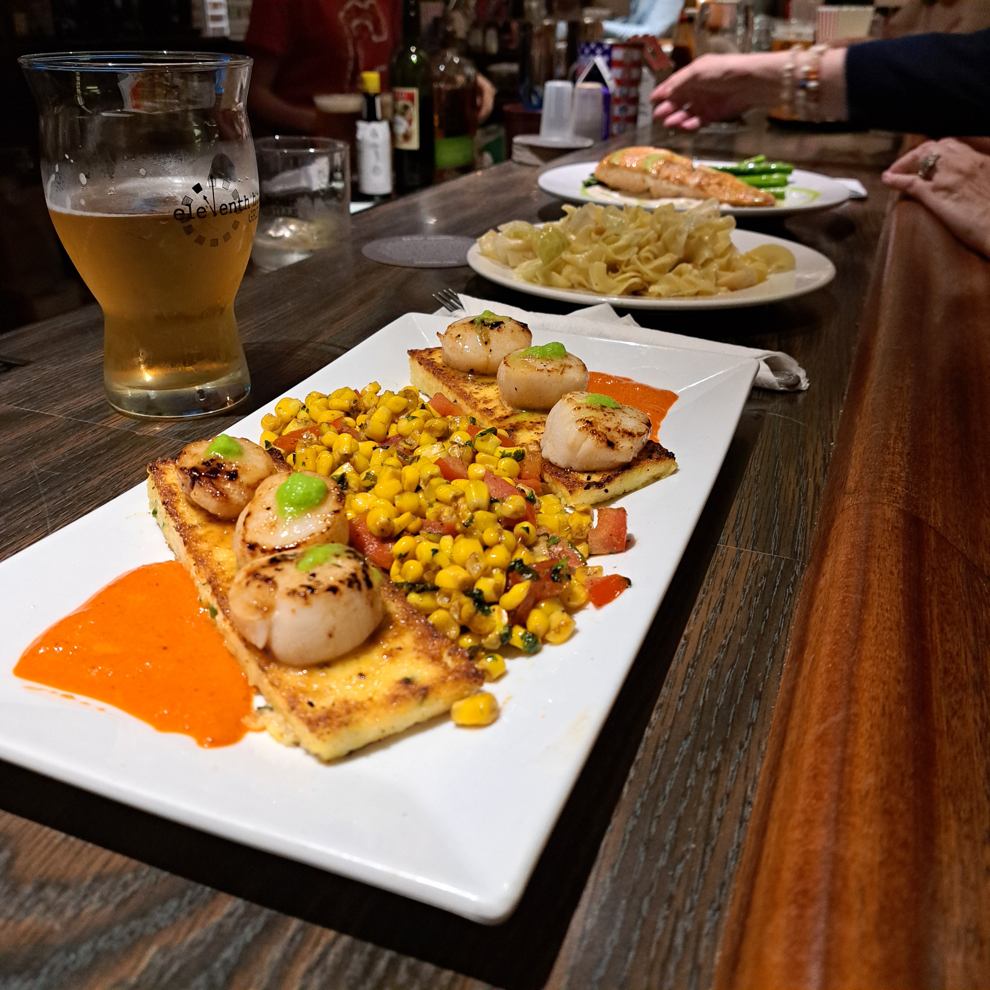 I ended up ordering the Scallop Symphony, which featured pan-seared scallops on a bed of crispy fried creamy polenta with southwestern corn and a roasted red pepper sauce as well as a side of pierogi (available as 2, 4 or 6 pierogi) and the Walleye Bites. The scallops won’t be available next week, so I thought it sounded fun. The fish and chips are always available. The scallops were delicious. The red pepper sauce had a bit of heat to it, but I did not find it that spicy at all compared to the Indian or Thai food I usually enjoy.