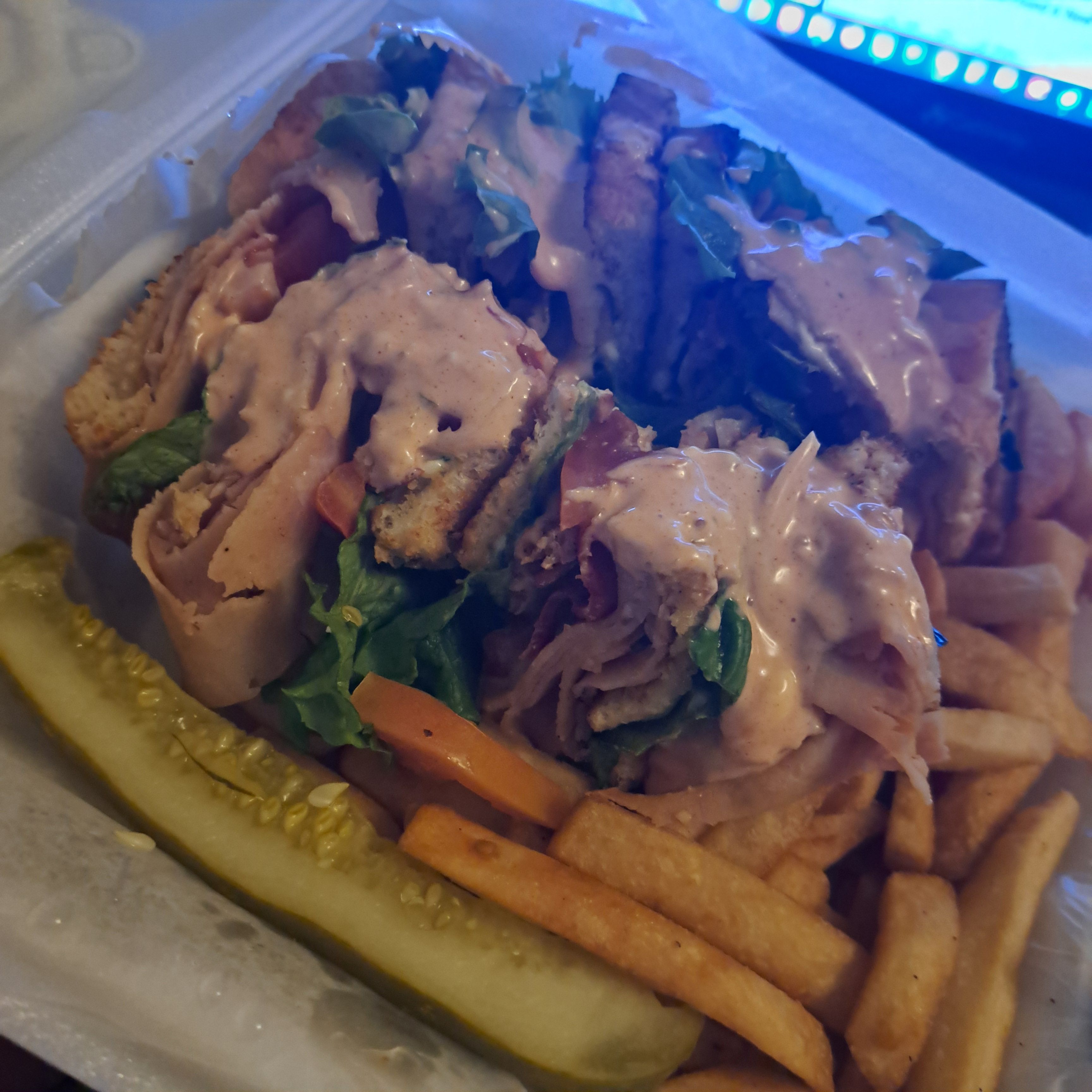 I also ordered a Turkey Club sandwich to go. It was properly cut into triangles with large toothpicks to hold the three layers together. It came with a side of fries, which were decent. I forgot to ask for a side of Thousand Island, but I was able to whip some up at home. I slathered my club sandwich in Thousand Island, as you can see in the picture. I also really enjoyed the pickle. It was fresh and had a nice crunch to it.