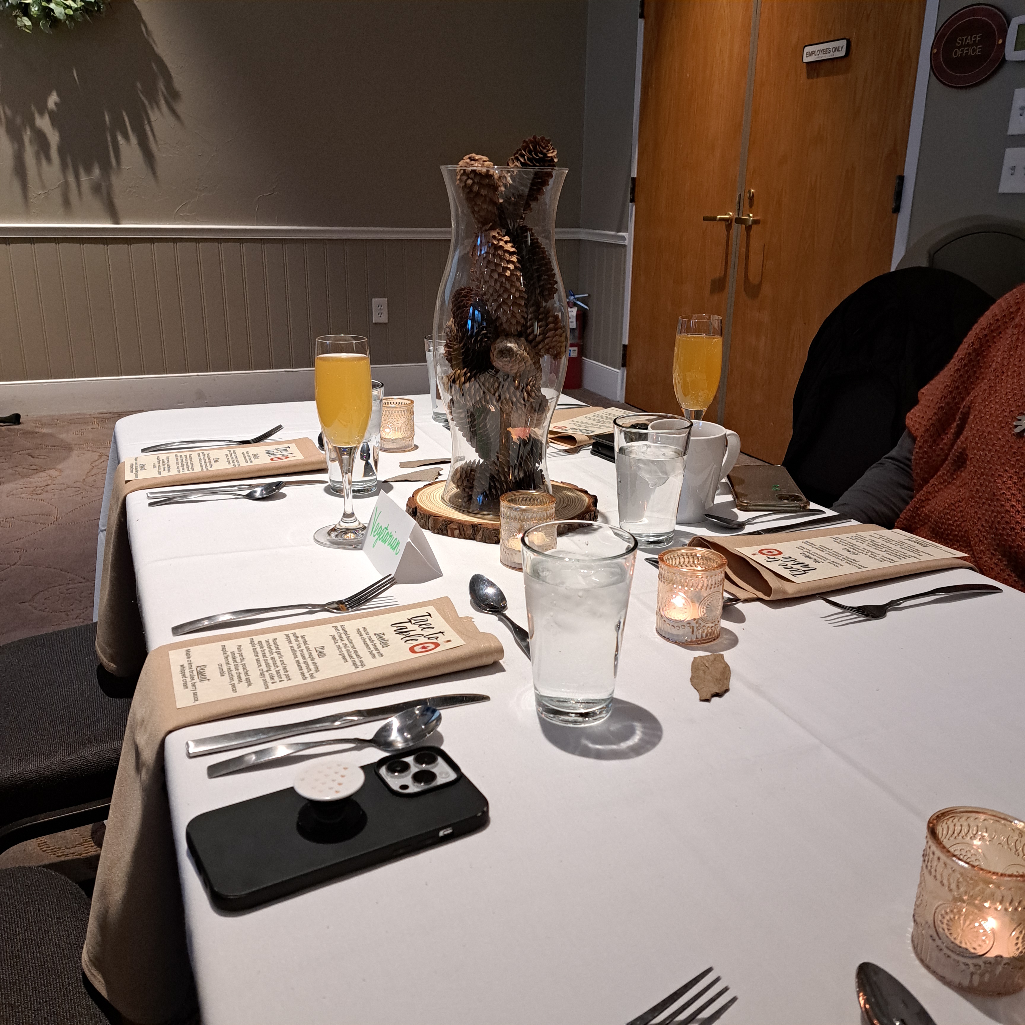 I had gotten a fish fry at the Emerald Necklace Marina during Covid and enjoyed it, so I knew the brunch would be a treat. I got there about 15 minutes before the 11 a.m. start time and was able to quickly check in, grab a maple-inspired cocktail using my provided drink ticket (I opted for coffee with Bailey’s and maple syrup) and grab a seat. I sat with a bunch of lovely people who made me feel welcome despite being by myself (again, I wasn’t the only one). One of the women had tried all three cocktails and stated that the Maple Syrup Mimosa was the best of the three, but they were all good. The other drink on offer was a Maple Syrup Old Fashioned, and there was a mocktail (below) as well as beer and wine to choose from.