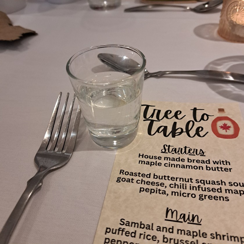 To start, the servers came around with small shot glasses of sap water, which was a refreshing start. Sap water is more water-like than syrup-like, and the ‘sap water’ that is collected from maple trees is boiled down to make syrup. It takes 40 gallons of sap to make 1 gallon of syrup. There is a long tradition in Ohio of collecting sap that started with the Native Americans in the area. We were told that we are lucky enough to live in an area that is ideally suited for maple syruping. The snowy cold weather (and it started snowing a bit as I was driving to the event) after several days of warmer weather encourages the sap to flow from the roots to the leaves in the trees our area, and Ohio is ranked fifth in maple syrup production. We live in the 0.005% of the earth that produces sap and maple syrup (I’m fairly sure that percentage is correct, but I could be wrong – but it is a very miniscule percentage of the earth’s land). So our ‘Cleveland winters’ are good for maple syrup production.