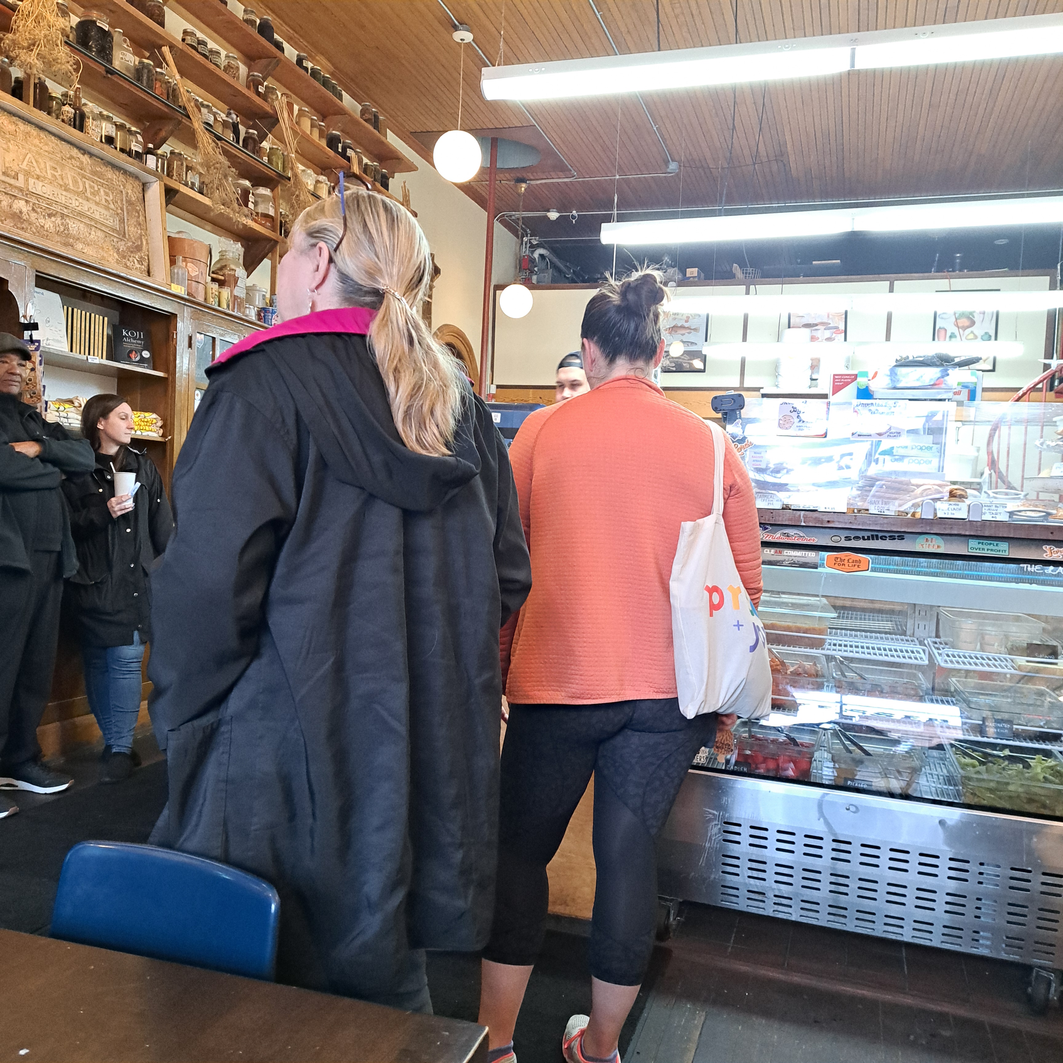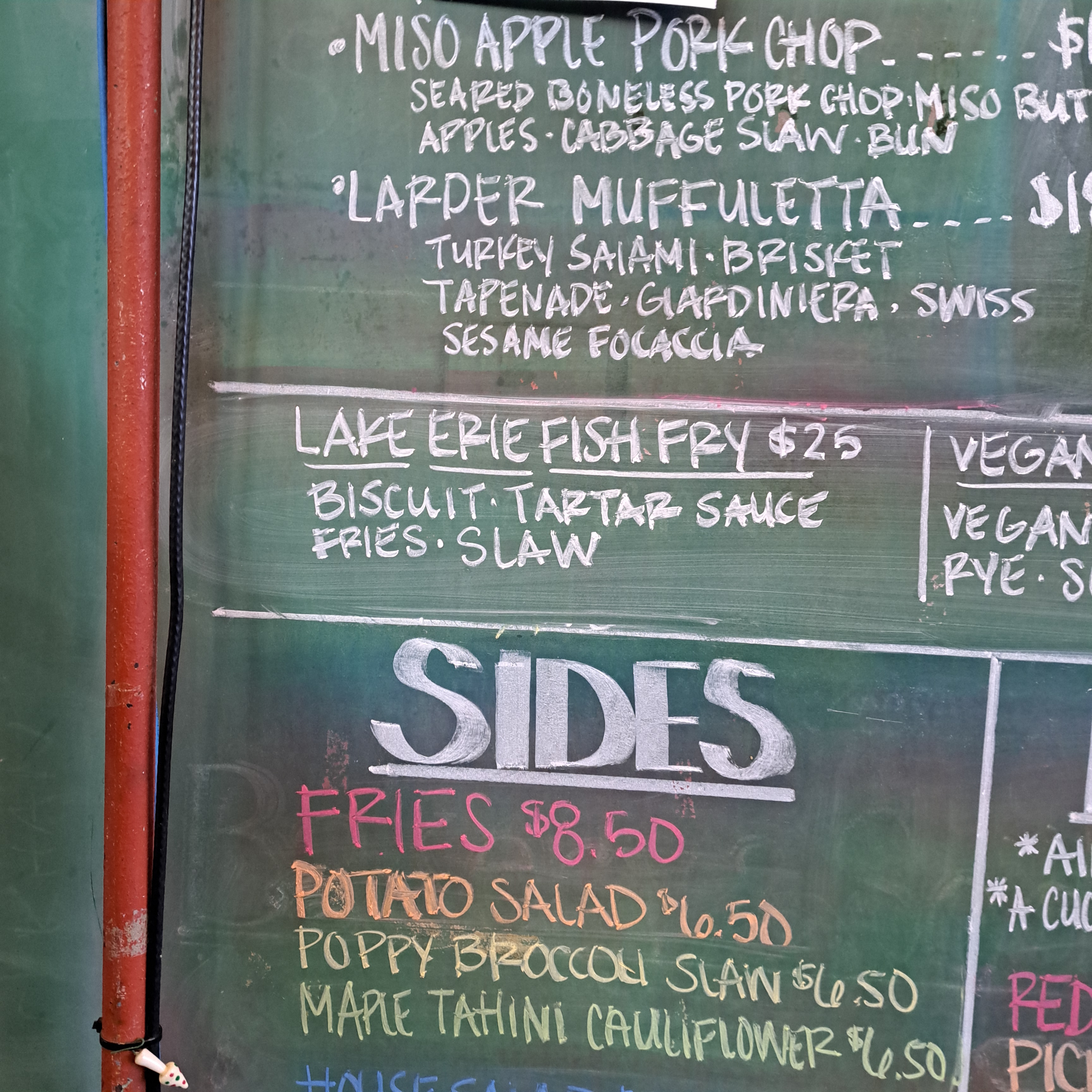 Larder is open from 11am-6pm Tuesday thru Saturday. They stop serving hot food at 5:45 p.m. The place was packed when I got there shortly before 1, but it was manageable. I was able to place an order for the fish fry, gave the cashier my cash (and stumped him when I gave him enough to give me a $10 bill and change), was given my number and took a seat at a larger table that seems like a community table. At least we turned it into one. The group that sat down with me after I ordered had planned a trip to the Rock Hall, but had to pivot when the power went out and it closed for the day. We talked a bit about Minneapolis and chatted about the Rock Hall and Cleveland.