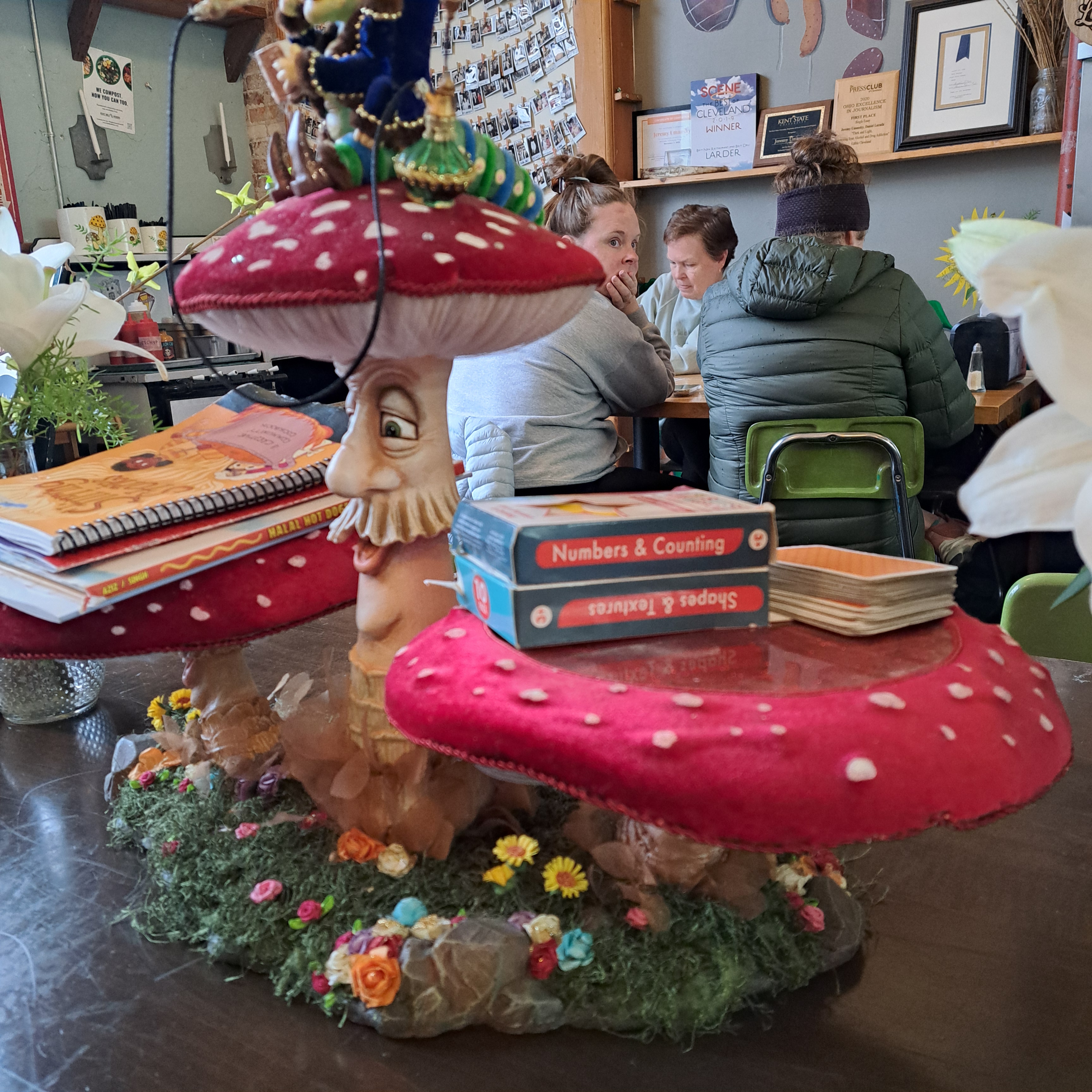 I had a delectable fried fish lunch at Larder Delicatessen & Bakery. Chef and owener Jeremy Umansky is a multi-year James Beard Award nominee, so I knew I was in for a good fish fry. Larder also has a vegan fish fry on offer, featuring fried tofu. The community table had some fun activities for kids (including a fun community cookbook from the kids who attend activities at Lake Erie Ink and some flash cards).