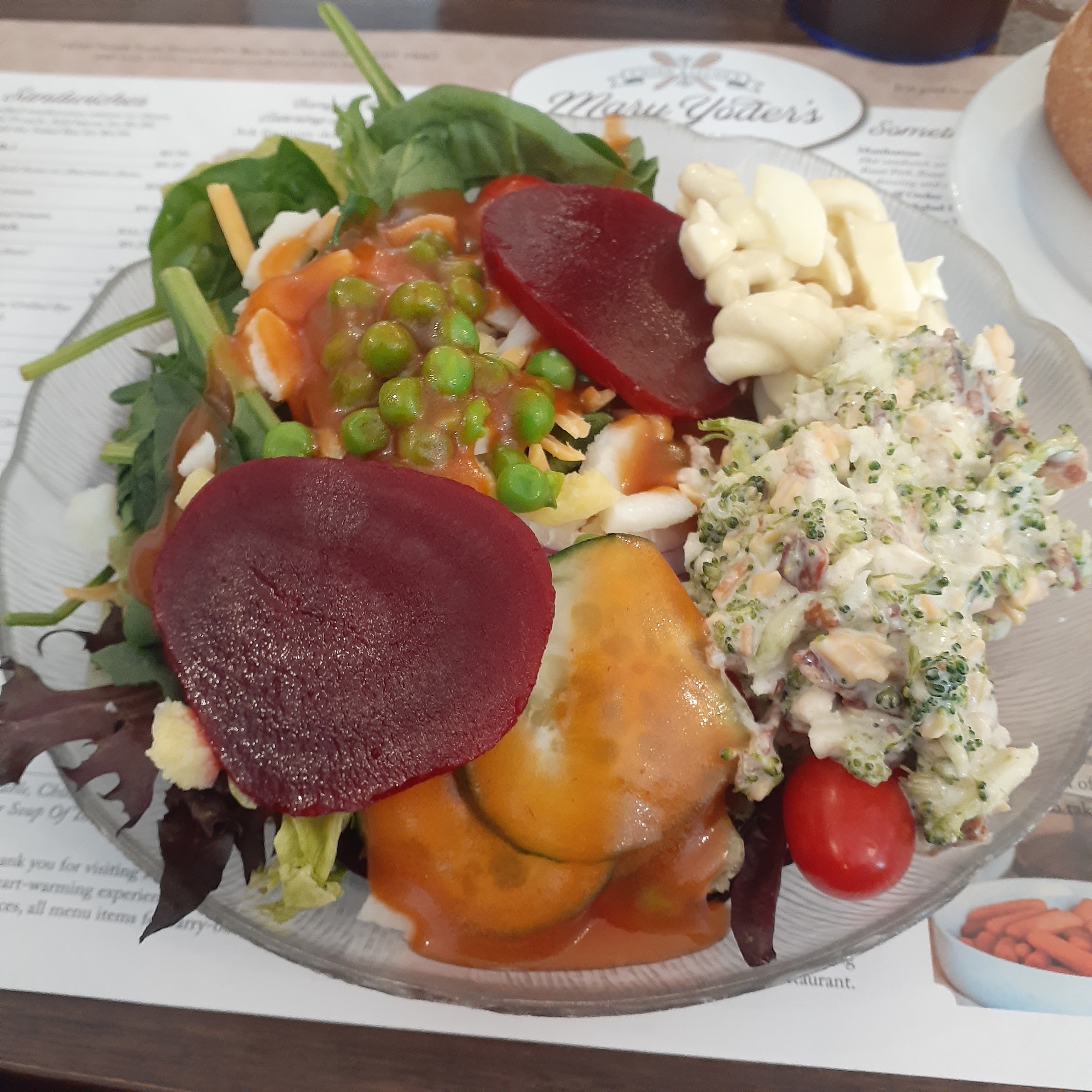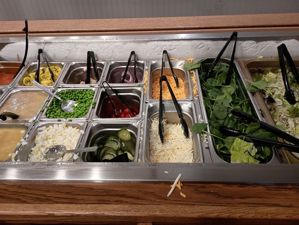 I adore a good old-fashioned salad bar, and the salad bar contains all my favorites – a nice selection of greens, hardboiled egg, peas, beets, red onion, tomato, cucumber, etc. There is always a decent wet salad or two to choose from. I love cottage cheese, broccoli salad or macaroni salad to pair on my salad, which allows me to use less salad dressing. It is always the highlight of the meal for me, which I then follow with a couple of selections on the lunch/dinner buffet for a couple of bucks more. I got a side of cottage cheese with a to go meal the other day and was amazed by how creamy and delicious their cottage cheese is. So much so that I called to find out who they get it from.
