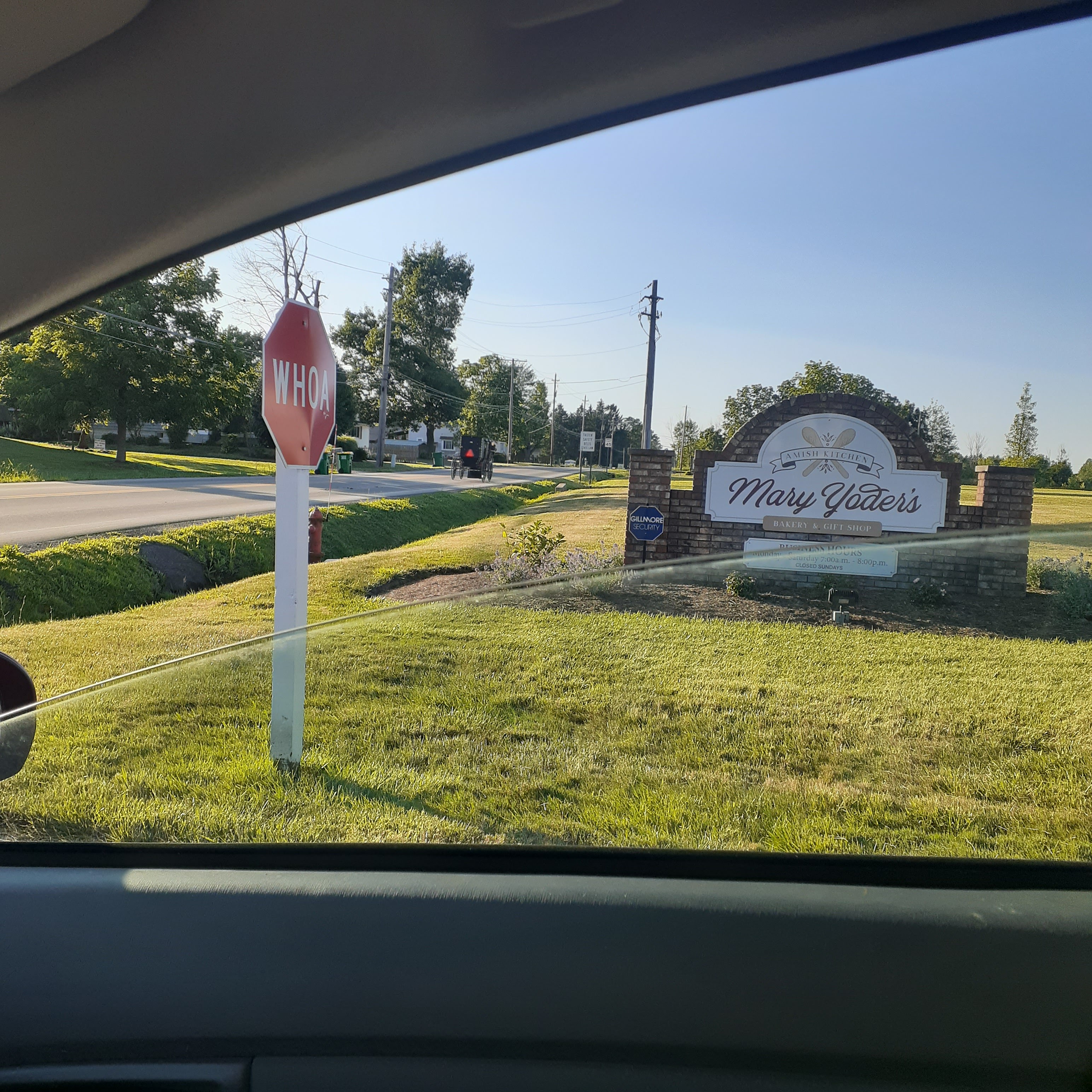 Mary Yoder’s also caters to the local Amish community and has a hitching pad for the horse and buggies to the back of the parking lot. Watch out for horse and buggies on the roads too and give them a wide berth. The Whoa stop sign as you leave always cracks me up.