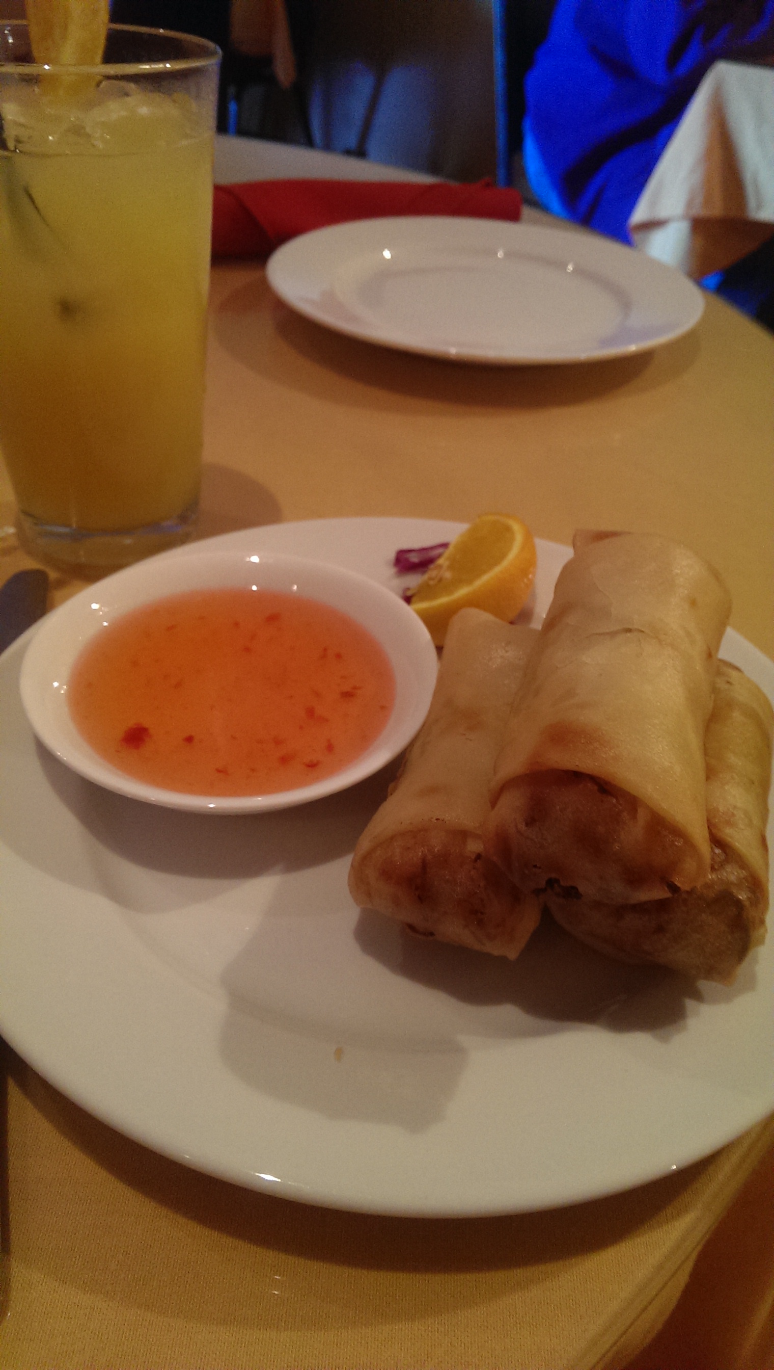 First of all, to start I highly recommend ordering some version of their Spring Rolls. The wrapper is super crisp and not greasy at all, and the contents are light and flavorful. They come three to an order, and