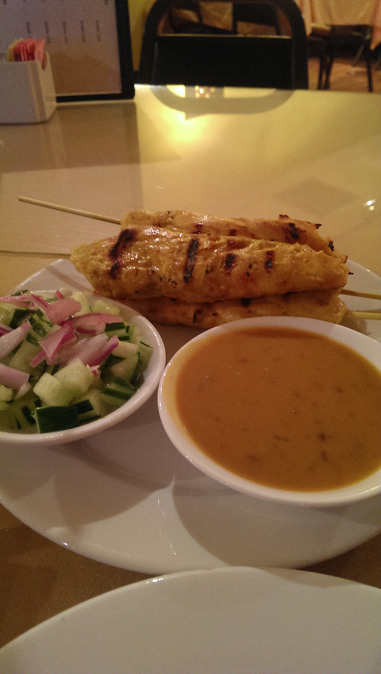 Another good starter is the Chicken Satay. It features four skewers of moist and delicious curried chicken breast served with a flavorful peanut sauce. The thing that really makes the dish for me is the slightly vinegary (but not overpoweringly so) cucumber and onion salad that is served with it. My only complaint is I kept spilling it.