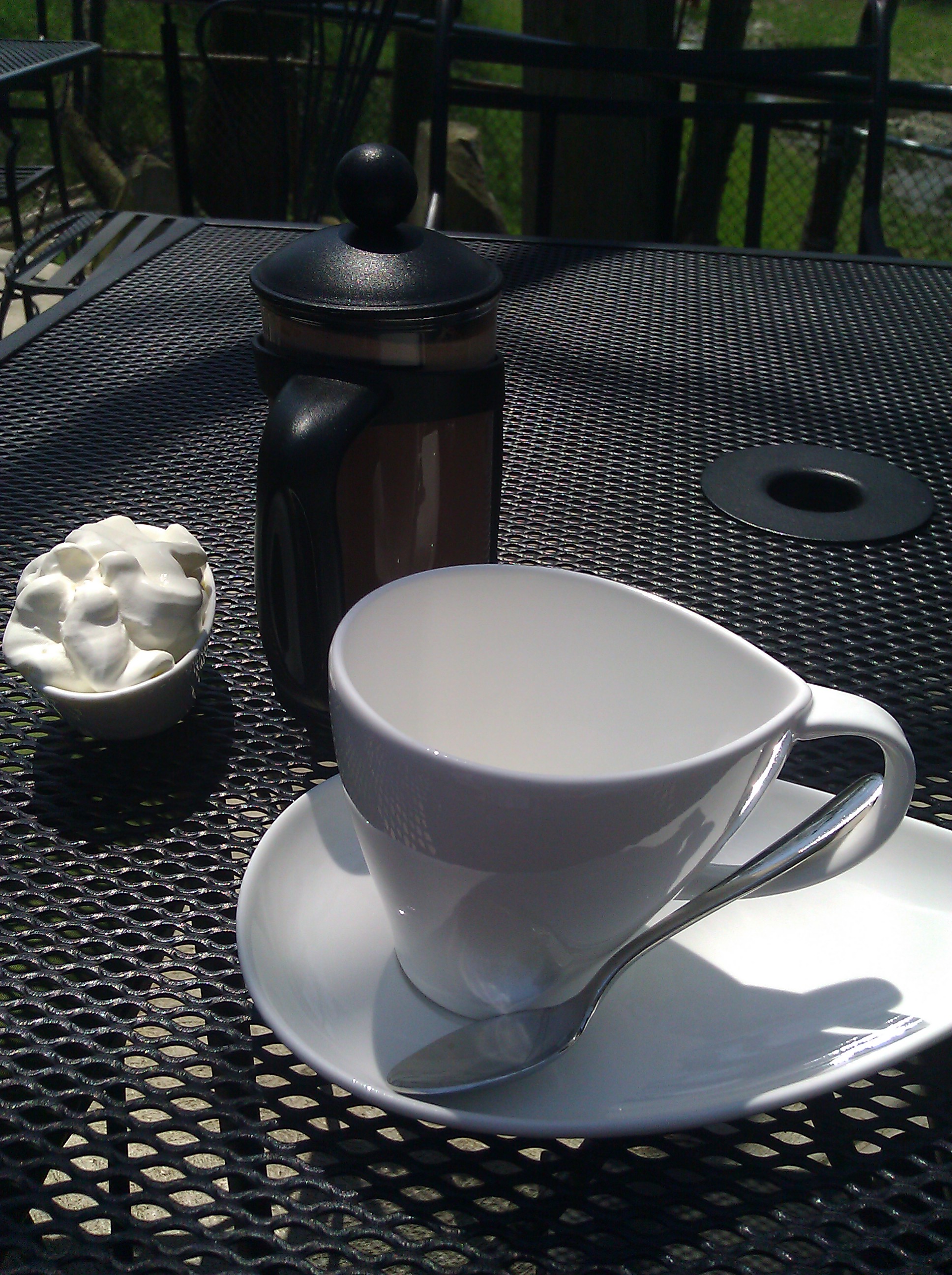 I absolutely swear by the hot chocolate, which is made from fresh whole or skim milk with Dutch cocoa and sugar and served in a Bodum press pot. It is served with a small bowl of marshmallows or fresh whipped cream on the side. Divine on a cold day!
