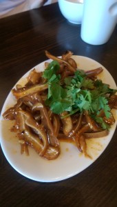 ginger and aromatics and that it was a whole fish. The servers suggested I order the Sweet & Sour Crispy Fish. I was a little skeptical that it was the one I remembered – and I’m not sure if it was, but that certainly did not detract from my absolute enjoyment of the dish. First of all, it was a beautiful sight, with the tail curled up. It was lightly fried and served over a luscious ginger and garlic sweet and sour sauce. This is not the gloppy, bright orange sweet and sour sauce you find at most Chinese restaurants. It is mouthwateringly good. I had to keep removing small bones, but I think that’s because I am less adept at deboning a filet. The