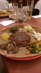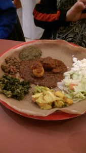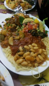 vegetables were absolutely outstanding. The rice is flavored with fenugreek, cumin, coriander, cardamom and turmeric. I loved the sautéed greens, white beans and rice. Other vegetables include peas and carrots, potatoes, and okra. They also served a green chopped salad of greens with cucumber, red onion, green pepper and tomato with fresh lemon for acidity. Squeeze bottles of hot sauce and ranch dressing were delivered to the table, and the server suggested the ranch went particularly well with the chicken. I just put it on my salad, preferring the taste of the meat to be unadulterated.