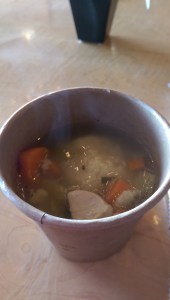 soup. It’s not just broth. There are chunks of carrot, celery and moist chicken in it. The smoked turkey on the turkey sandwich was moist, and the BBQ sauce and mustard were not too heavy. I absolutely loved the potato salad. It is a red skin potato salad and is perfectly creamy.