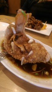 ginger and aromatics and that it was a whole fish. The servers suggested I order the Sweet & Sour Crispy Fish. I was a little skeptical that it was the one I remembered – and I’m not sure if it was, but that certainly did not detract from my absolute enjoyment of the dish. First of all, it was a beautiful sight, with the tail curled up. It was lightly fried and served over a luscious ginger and garlic sweet and sour sauce. This is not the gloppy, bright orange sweet and sour sauce you find at most Chinese restaurants. It is mouthwateringly good. I had to keep removing small bones, but I think that’s because I am less adept at deboning a filet. The