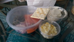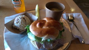 soup. It’s not just broth. There are chunks of carrot, celery and moist chicken in it. The smoked turkey on the turkey sandwich was moist, and the BBQ sauce and mustard were not too heavy. I absolutely loved the potato salad. It is a red skin potato salad and is perfectly creamy.