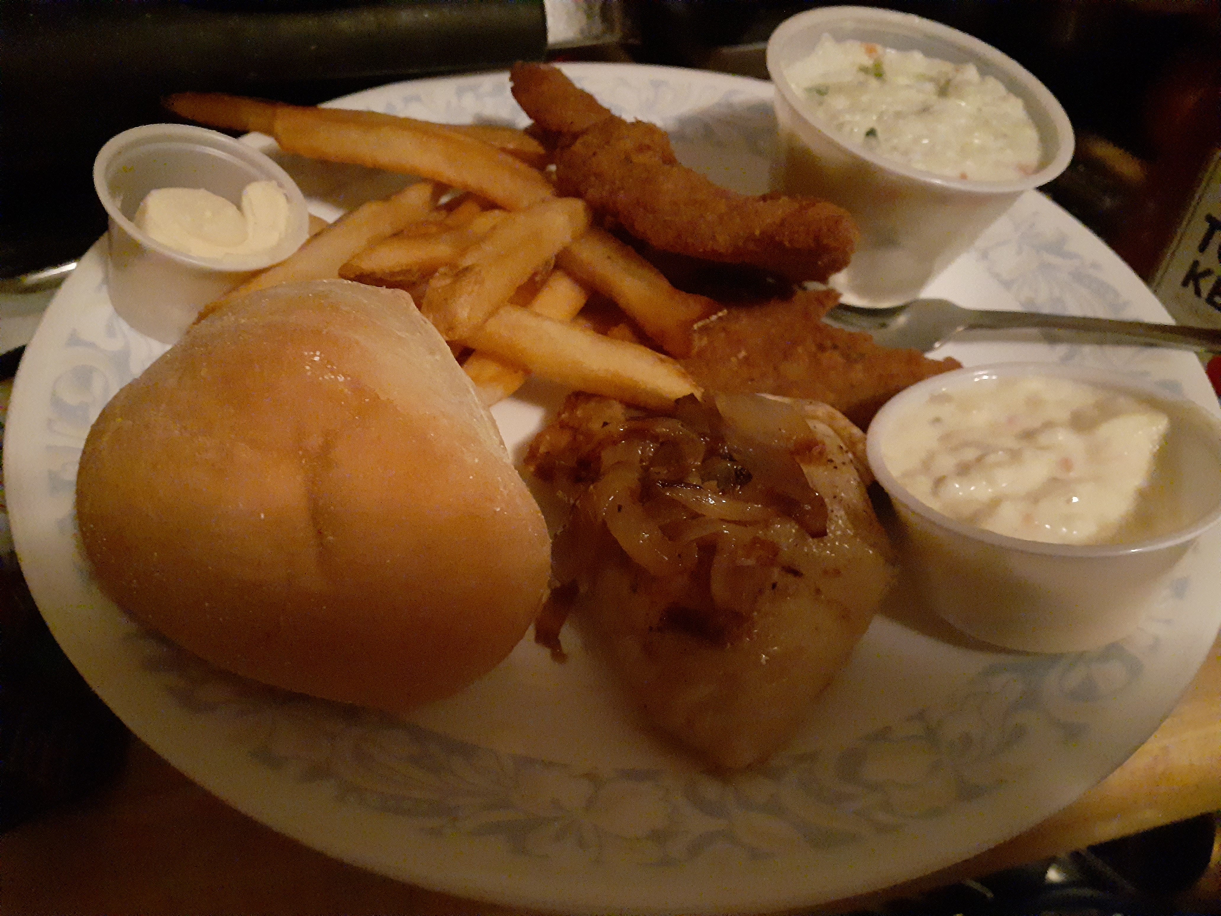 Since it was take-out I can’t rate the freshness. The perch and fries were a little soggy from being in the takeout container, but the second half heated up nicely the next day in the air fryer. I really enjoyed the cole slaw. It definitely ranks up there with my favorite cole slaws. It is mayo-based with just a hint of sweetness. The dinner roll was meh, but the honey butter was delicious and definitely made it better. The pierogi seemed homemade. The potato and cheese filling was nicely seasoned and the outside was not overly doughy.