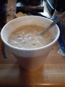 Once I paid, bought my pop and sat down I opened up the to-go box (which I requested because I knew I wouldn’t finish) and was just overwhelmed by the food service of it all. I thought I’d have a couple pierogi and chowder with a few bites of fish and pack up the rest. The chowder was the blandest, worst chowder I’ve ever had, so I popped the lid back on and will be doctoring it up tomorrow for lunch. Nothing a little dill and seasoned salt can’t fix. The pierogi did not look appetizing at all, but they weren’t as dry as they look. That was the best part of the meal. The fish was okay. It could have been moister, but it was at least edible. The cole slaw was okay. I chose the baked potato since it is easier to warm up as leftovers, although this isn’t a meal I am looking forward to eating again.