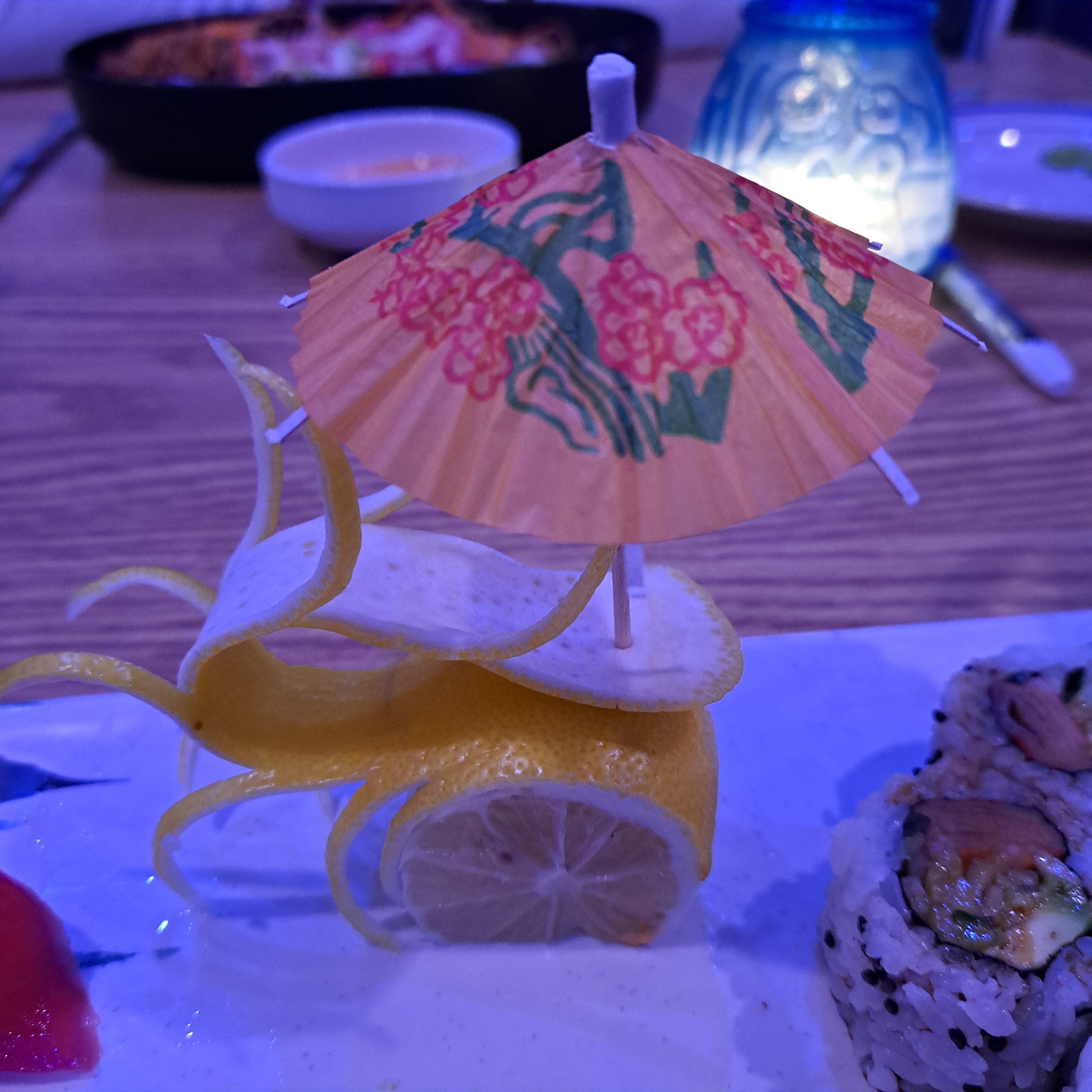 The first time I went, I went by myself to check it out. It had just opened. I had been anxiously waiting for it to open. The sushi that was going out was pretty good. I grabbed a good selection of nigiri and rolls. I had to ask the waitress for wasabi and ginger as well as things like gyoza or takoyaki, but that’s preferable to something fried sitting on the conveyor belt for too long. The nigiri was well-portioned, but the rice fell apart too easily. It needed something to pack it together. I really enjoyed the Godzilla Roll and Mango Tango Roll because they were so flavorful. Save your money on the obviously canned fruit. The pineapple was just canned pineapple, but the orange slices in visit 2 were refreshing.