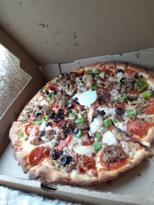 I had never heard of Congin’s until I attended a Bordeaux wine dinner by myself at Le Petit Triangle. I was sat at a larger table of strangers, and we were trading favorite food tips (as foodies tend to do). One of the women, who I recognized as a writer for the Cleveland Heights Observer, recommended the pizza at Congin’s. Congin’s Pizza is a family-owned restaurant that has been in business for over 27 years. Apparently there are two locations – Congin’s Pizza in Chardon and Congin’s Italian in Cleveland on Nottingham Road & St. Clair near the Euclid/South Collinwood border). I drove past the Nottingham location, and it took me a second to recognize it. It looks like an unassuming auto body repair shop. One Yelper describes it as “a very unassuming, bare bones building lacking in even a modicum of charm.” I made a point to stop for a pizza (making the mistake of not calling it in – I sat and waited in the austere waiting area for a while). It was worth the wait, and I’ve been frequenting Congin’s Italian ever since. It is a quick drive from Cleveland Heights once I learned the back roads, and it serves what I think is the best old-school, American-style pizza in Cleveland. The crust is delicious, the red sauce is not too sweet and not too acidic, and they are generous with the toppings. I especially like the generous clumps of sausage. I am hooked. In fact, I was driving for Lyft on Valentine’s Day and decided to call it a night when I was near Bedford. I called in a pizza order to Congin’s and drove all the way there to get my pie just before they closed at 10 pm. Driving 271 to 90, I got off at E. 185th, and it was a quick trip until I was there on Nottingham. They have a drive-thru window if you’re lazy and don’t want to get out of car. I can’t usually wait until I get home and dig into the pizza as soon as I can. The melty cheese stretch brings so much satisfaction, and I rush to get the slice in my mouth before the warm toppings slide off. I’ve gotten pretty good at holding it so it all stays together. I order the same pizza every time – the Deluxe, which features pepperoni, sausage, mushroom, green pepper, black olive, and onion. I think about switching it up every once in a while, but why mess with perfection.