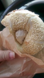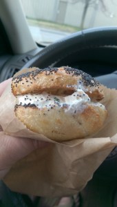 This most recent visit also had me trying the thyme black peppercorn horseradish schmear. I paired it with the poppyseed bagel again, and it was once again a winner. I love horseradish. I took it apart and added a slice of Boar’s Head rare roast beef to each half for a very lovely lunch.