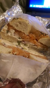 One weekend I ordered the special bagel of the day, which was the Midtown (below). It features egg, bacon, cheese, avocado and hot pepper jelly. I really enjoyed it – even though the avocado was missing this time. I’d order it again, but maybe not with hot pepper jelly. I’ve had the egg, bacon, cheese and egg, bacon, cheese and avocado breakfast bagels before and enjoyed them a lot.