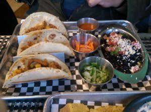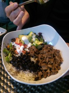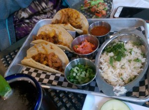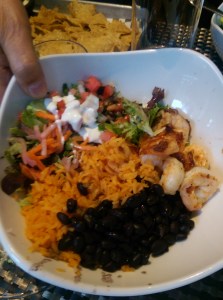 My other friends were very pleased with their tacos and rice bowls. The waitress had recommend the Tacos al Pastor, which are spice rubbed pork, pineapple, cilantro and onions in a tomatillo sauce, so two of my friends chose that. One with the Mexican rice and one with the black beans as their side dish. My other friends ordered rice bowls – one with steak and one with shrimp. The rice bowls have a mix of greens, black beans, avocado, pico de gallo and sour cream. One chose the cilantro white rice and the other asked to swap the white rice for Mexican rice, which was easily accommodated. They both finished their bowls.
