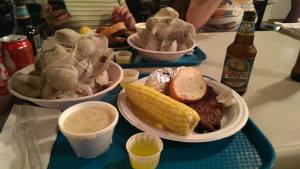 I treated myself to a clambake at Sokolowski’s, which is the one I recommend, last Saturday. Sokolowski’s serves their clambake every Saturday in October and do not advertise it on their social media. They don’t have to. I got there at 5:15 and the line was out the back door and into the parking lot. We stood in line for a little over an hour and slowly made our way through the restaurant. I witnessed one old couple make their way through the restaurant and jump to the front of the line. Don’t be that person—even if you have reserved a clambake (which Sokolowski’s recommends) you still have to stand in line with the rest of the plebians. There were a lot of delicious choices being offered that night – including grilled red snapper, mussels in a cream sauce, grilled trout, battered cod or perch as well as the usual kielbasa, meatloaf, chicken paprikash and stuffed cabbage. I decided if they were out of clambakes by the time I reached the steam pans I would get a dozen clams, a bowl of clam chowder and a kielbasa dinner to go (so I could eat the side salad there). Luckily they still had clambakes by the time I ordered at around 6:30.