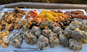 This season I treated myself to two special clambakes in restaurants, and a friend had me over for a clambake she purchased from SweetBerry Fresh Market in Wickcliffe. You need to preorder them. The SweetBerry clambake was $14.99 per person and included a dozen clams, 1/2 a chicken, a huge sweet potato, an ear of corn, cole slaw and a dinner roll. You can also order 100 medium-neck clams for $49. She did not boil everything together, but instead prepared everything separately in her kitchen. I’m not usually a fan of chicken with a clambake, but I tore into the white meal of the chicken and loved every bite. I shared some of my dark meat with my dog. I managed to eat everything but the sweet potato, and she had made a pear cake for dessert. We sat around the table and caught up. It was a nice way to spend a Friday evening.