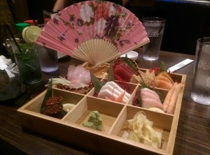 The next time I went I met a group of people for dinner. We all ordered a roll or two and passed them around, so we got to try a little of everything. Some of us also ordered some appetizers. I ordered the sushi appetizer, and my friend ordered the soft shell crab. Another friend ordered the pickled mackerel, which pairs well with a martini. I loved the soft shell crab the best and would order it again. My friends make fun of me for my unintentionally phallic photos. They ribbed me once again for the sushi appetizer. My friend had posted a photo to Facebook, and they automatically asked if that appetizer was mine. No fair! I chose the Snow Mountain Roll that night in addition to the Monkey Roll. I loved the Snow Mountain Roll, so keep that in mind if you are trying to choose. But the entree that blew us all away that time was the sushimi boat for two. Since one of my friends is diabetic he tends to stay away from rice if he can. The sushimi boat was absolutely stunning. They really do a great job with presentation here.