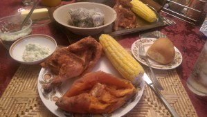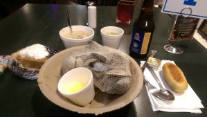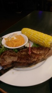 I obviously quickly ordered the clambake ($40) and chose the 12 oz NY strip steak instead of the 1/2 chicken, candied yams instead of red skin potatoes, and sweet corn instead of green beans. The clambake also apparently came with garlic toast (but I never was offered that and grabbed a dinner roll instead) and a slice of pumpkin or apple pie for dessert. I chose a Fat Heads Bumble Berry Ale to top it off. I started with the clams, because they get cold quickly. I dipped the tender clams in the melted butter and didn’t have a single closed clam indicating a bad one. The clam chowder is the best clam chowder I have ever eaten – with chunks of chopped clam that are clearly not from a can, perfectly cooked red skin potatoes and lots and lots of delicious flavor. I managed to eat half of the steak, yams and ear of corn. I even loved the clam broth here, which I normally don’t bother with. Once stuffed, I got a box for the steak, yams and corn, grabbed my pumpkin pie (which was wrapped on a plastic plate I could just bring home with me) and headed home, looking forward to lunch or dinner the next day.