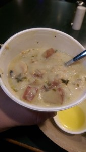 The house soup is their lasagna soup. I haven’t had a chance to try it, because I don’t want to overload on tomato sauce when I’m there but I will soon. I have tried one of their soups of the day. The soup that day was “chicken soup,” and it was a delightful soup that was reminiscent of Italian wedding without the meatballs and tons of escarole. There were some greens and tiny pasta balls. I had to add just a bit of salt and pepper to it to liven it up to my liking, but I happily finished it.