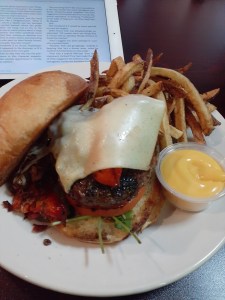 The Burger of the Month in January was some health-conscious one wrapped in lettuce, so I skipped it. However, February’s Burger of the Month, Coldwater Lobster Love, featured a half pound burger of ground brisket, chuck and short rib (for one damn tender burger patty), smoked bacon, coldwater lobster meat poached in Cajun butter, Muenster cheese, tomato and arugula on your basic burger bun. This burger was decadent AF. I ordered it medium rare and it practically melted in my mouth. It was once again perfectly cooked. I paired it with an El Dudearino, which is Van Gogh Espresso vodka, Kahlua and cream. When I finished that I switched to iced tea because the snow was starting to fly and I wanted to have my wits about me for the drive home.