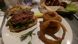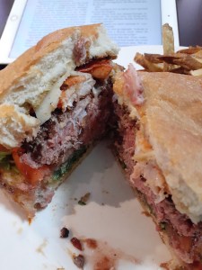 and melted together with the beef. I took a photo of the cross-section because it is a sight to behold. My friend and I split it (and ordered onion rings instead of fries) in addition to ordering a few appetizers for the table to share.