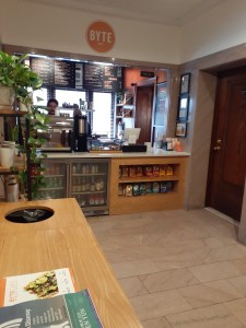 The Byte Cafe is an unassuming little place at the end of the ground floor hallway with a fun little eating area with leaded glass windows. It gets crowded during the lunch rush when all of the business people in the building head down for lunch. I go after lunch rush hours and before they close. And get it to go.