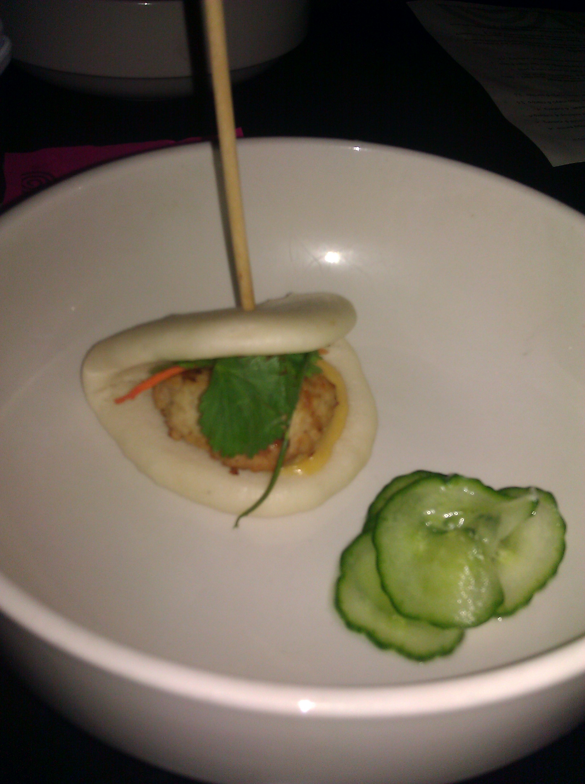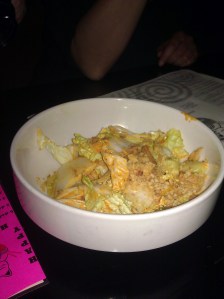 I ordered the pho with rare beef (Pho Dac Biet). I wasn’t in the mood for fatty brisket and don’t like the texture of pho meatballs. The pho came out piping hot with a little cap of raw beef peeking out. I added the mung beans and basil leaves and gave it a deft squeeze of lime. The beef was tender and juicy, the noodles were perfectly cooked, and it had a deliciously savory broth. The broth was so good that I didn’t need to add any sriracha or hoisin to it, like I usually do. I enjoyed as much as I could and packed the rest up to go. One of my fellow diners taught me the trick of packing up the noodles separate from the broth so the noodles don’t disintegrate.
