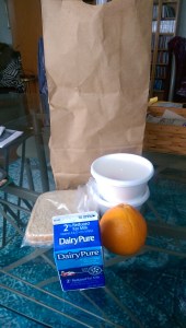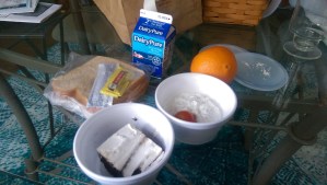 kind of side salad. Today it was a turkey and American cheese sandwich (with two slices of turkey instead of one – we had complaints) and mayo and mustard packets, a carton of milk, an orange, a slice of cake, and cottage cheese with a cherry tomato. The meals are always balanced and nutritious.