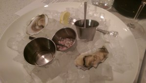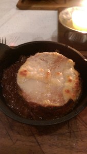 I could not decide between a few oysters off the Raw Bar section or the French onion soup (it was a cold night), so I decided to order both. At $3 each or by the dozen for $30, I could pick and choose however many I wanted. I ordered two – one from the East coast and one from the West. The oysters were pristine and served with a range of add-on sauces, including mignonette sauce (a condiment made of minced shallots, cracked pepper and vinegar), a light hot sauce, and a lemon wedge. I preferred the oyster from the West coast, because it reminded me of the salty, briny Jersey ocean of my childhood summers. The East coast oyster was smaller and lighter in taste, not as “fishy.” I can’t wait to go back and order a plate of them and scheduled a dinner for a couple weeks from now with my dining out group.